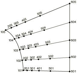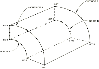 The quarter circles INSIDEA (nodes 1101–1105), OUTSIDEA (nodes 1501–1505), INSIDEB (nodes 6101–6105), and OUTSIDEB (6501–6505) have already been defined by specifying their coordinates directly or generating them incrementally. The region is filled by first filling the end planes and placing the nodes on those planes into sets A and B and then filling between those sets with the following options:*NFILL, NSET=A INSIDEA, OUTSIDEA, 4, 100 *NFILL, NSET=B INSIDEB, OUTSIDEB, 4, 100 *NFILL A, B, 5, 1000