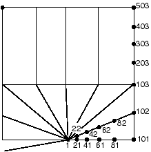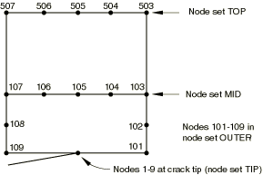 (The mesh shown is very coarse, and a finer mesh would probably be used in an actual case.) The nodes on the top edge have been placed in node set TOP, those on the horizontal line at the upper end of the focused region are in node set MID, all of the nodes around the focused region are in node set OUTER, and there are multiple nodes at the crack tip in node set TIP. The following options are used to fill in the region as shown in Figure 2.1.1–12 (note the quarter-point nodes adjacent to the crack tip):*NFILL, BIAS=0.8 MID, TOP, 4, 100 *NFILL, SINGULAR=1 TIP, OUTER, 5, 20