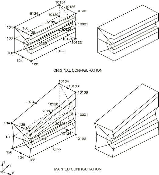 To map by means of blended quadratics in Abaqus/Standard, you define the new (mapped) coordinates of up to 20 “control nodes”: these are the corner and midedge nodes of the block of nodes being mapped. The mapping in this case is like that of a 20-node brick isoparametric element. Any of the midedge nodes can be omitted, thus allowing linear interpolation along that edge of the block. Abaqus/Standard does not check whether the nodes in the set lie within the physical space of the block defined by the corner and midedge nodes: these control nodes simply define mapping functions that are then applied to all of the nodes in the set.