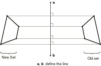 To reflect the old nodal coordinates through a line, you specify the coordinates of points a and b (see Figure 2.1.1–4).