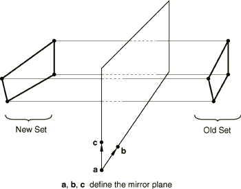 To reflect the old nodal coordinates through a plane, you specify the coordinates of points a, b, and c (see Figure 2.1.1–5).