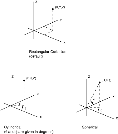 You can specify that a local rectangular Cartesian, cylindrical, or spherical coordinate system be used for a particular node definition. These coordinate systems are shown in Figure 2.1.1–2.