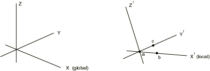 You set up the coordinate system specification by specifying the global coordinates of three points in the local system: the origin of the local system (point a in Figure 2.1.1–1), a point on the local