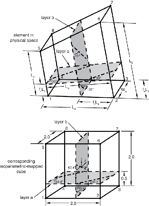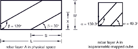 , equal to 30° for layer A. This angle must be transformed into the corresponding angle in the isoparametric-mapped cube. This transformation can be done as follows: consider a single rebar that intersects the intersecting line (described above) and an adjacent edge (see Figure 2.2.4–15).