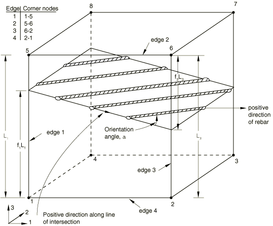 , of the rebars within the rebar layer is defined in the isoparametric-mapped cube; it is measured in degrees and is the angle between the line of intersection of the rebar surface with the face for the isoparametric direction chosen and the rebar. The positive direction of the line of intersection is from the lower numbered edge to the higher numbered edge; the positive direction for the rebars points into the elements. An example is shown in Figure 2.2.4–14. The orientation angle is defined in the rebar layer in the isoparametric-mapped cube; therefore, the definition is the same for isoparametric and skew rebar.