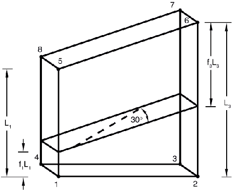The position of each surface is given by the fractional distance f from an edge of the face defined in Figure 2.2.4–12 for the isoparametric direction chosen; you must specify the edge from which the fractional distance is measured.If skew rebars are defined, the two edges of the rebar surface, which are not parallel to the user-specified isoparametric direction, are generally not parallel to one of the other isoparametric directions. The positions of these two edges of the rebar surface are specified by the intersection of the rebar surface with edges of the intersecting face, defined in Figure 2.2.4–12, for the isoparametric direction chosen; the intersections are given by the fractional distance f along each edge of the face. (Note that the fractional distance is along the edge for skew rebars; for isoparametric rebars the fractional distances are measured from an edge.) The fractional distance along an edge is measured from the first node of the edge. All four fractional distances must be given, but only two can be nonzero.