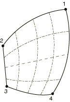 If opposite edges of the element containing the rebar are not parallel, the rebar directions will be different at each of the integration points within an element (see Figure 2.2.4–2).Figure 2.2.4–2 “Isoparametric” rebar directions in a distorted three-dimensional shell or membrane element (dashed lines indicate rebar directions).