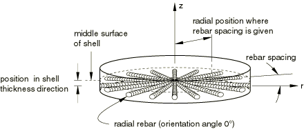 , measured in degrees; and the radial position at which the rebar spacing is measured. The angular orientation is measured positive about the positive normal to the shell or membrane element. If the shell's thickness is defined by nodal thicknesses (“Nodal thicknesses,” Section 2.1.3), the distance from the midsurface will be scaled by the ratio of the thickness defined by the nodal thickness to the thickness defined by the section definition. If the shell's thickness is defined with a distribution (“Distribution definition,” Section 2.8.1) the distance from the midsurface will be scaled by the ratio of the element thickness defined by the distribution to the default thickness.