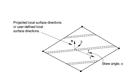 Skew rebars need not be similar to an element edge; they can lie at any prescribed angle from the local 1-axis. The direction of the rebars must be defined in one of two ways, as indicated in Figure 2.2.4–3: