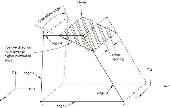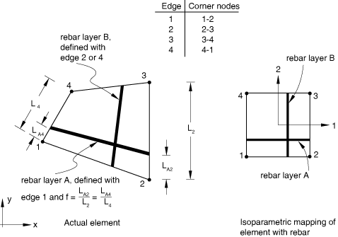 (as described above); the fractional distance from the edge, f (the ratio of the distance between the edge and the rebar to the distance across the element); and the edge number from which the rebars are defined. In addition, for axisymmetric elements you specify the radial position at which the rebar spacing is measured.