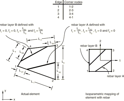 For isoparametric rebars the intersection of the rebar layer with the plane of the model will lie along the mapping of a constant isoparametric line in the element. You specify the elements that contain the rebars; the cross-sectional area, A, of each rebar; the rebar spacing, s; the rebar orientation,