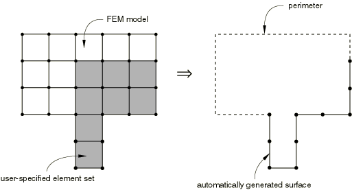 You can define the facets of a surface by specifying a series of elements. The faces of these elements that are on the exterior (free) surface of the model are included in the surface definition.