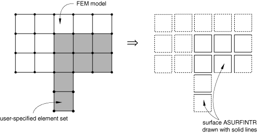 For example, if the name of the shaded element set in Figure 2.3.2–3 is ESETA, the surface named ASURFINTR (the elements in the figure have been reduced in size to differentiate faces that share the same nodes) is specified by *SURFACE, NAME=ASURFINTR, TYPE=ELEMENT ESETA, INTERIOR |