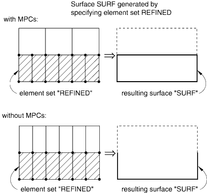 Multi-point constraints (“General multi-point constraints,” Section 35.2.2) involving nodes on exposed surfaces are not taken into account during free surface generation, which can result in faces that are not on the exterior of a body being included in surface definitions. For example, the nodes of the elements in element set REFINED shown in Figure 2.3.2–1 are used in linear, mesh-refinement constraints. The surfaces generated with and without multi-point constraints are shown in Figure 2.3.2–1.