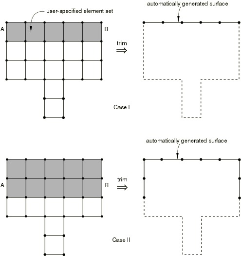 In Case I the surface definition consists of a single layer of elements on the perimeter of the model. Using automatic surface facet generation, the resulting default surface (curve) includes the vertical element faces A and B since these faces lie on the perimeter of the model. Trimming the default surface created in Case I eliminates faces A and B since their presence results in the two spurious corners near the perimeter of the curve.