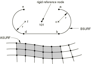 For example, the definition of the two-dimensional rigid surface depicted in Figure 2.3.4–2 is *SURFACE, TYPE=SEGMENTS, NAME=BSURF START, where |
