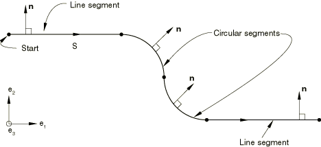 along the rigid surface from the starting point of the first segment to the ending point of the last segment. The outward surface normal is created by taking the cross product of the vector