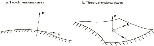 , is defined such that the outward surface normal and the two surface tangents form a right-handed orthonormal system, as shown in Figure 2.3.4–7.
