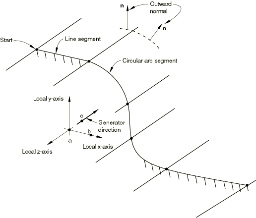 )—in the default global coordinate system. As shown in Figure 2.3.4–3, point a defines the origin of the local system; point b defines the local x-axis; and point c defines the generator vector, which is the negative local z-axis. The line segments forming the cross-section of the rigid surface are defined in the local x–y plane. The three-dimensional surface is formed by sweeping this cross-section along the generator vector. The resulting surface extends to infinity in both the positive and negative directions of the generator vector.