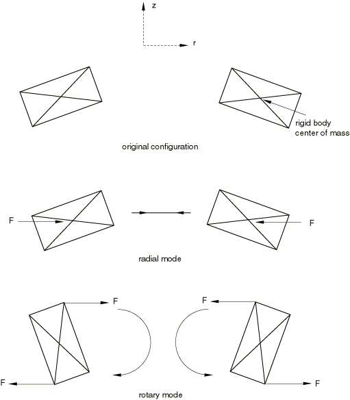 Translation in the r-direction is associated with a radial mode, and rotation in the r–z plane is associated with a rotary mode (see Figure 2.4.1–2). For an axisymmetric rigid body in Abaqus each of these modes develop no hoop stress, but mass and inertia computed for these degrees of freedom represent the modal mass associated with their modal motion. The mass properties for an axisymmetric rigid body are, therefore, calculated based on the initial configuration assuming the following: