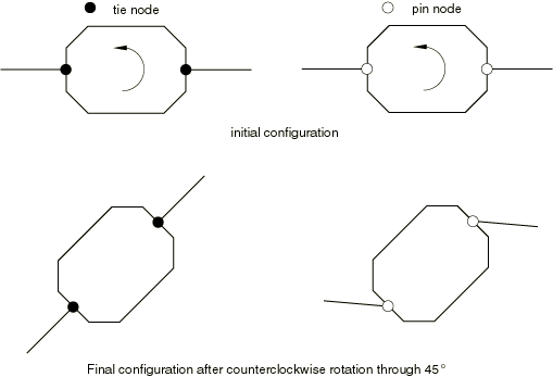 The node type has important implications when the node is connected to rotary inertia elements, deformable structural elements, or connector elements or when the node has concentrated moments or follower loads applied to it. Rotary inertia elements and applied concentrated moments affect the rigid body only when associated with a tie node. Rigid body connections to deformable elements always involve the translational degrees of freedom; rigid body connections to deformable shell, beam, pipe, and connector elements also involve the rotational degrees of freedom if the connection is at a tie node. The behavior of the two types of connections is illustrated in Figure 2.4.1–1, which shows an octagonal rigid body connected to two deformable shell elements through nodes at opposite ends subjected to an applied rotational velocity.