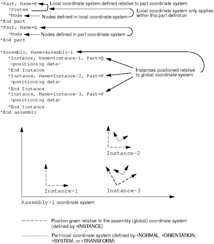 Local coordinate systems defined within a part or part instance will be translated and rotated according to the specified positioning data, as shown in Figure 2.10.1–5. (In this figure details such as element and section definitions are omitted for clarity.) Results given in a local coordinate system are output in the transformed local system. Equations will also be translated and rotated according to the positioning data for an instance. All data within a part (or part instance) definition are defined relative to the part's local coordinate system; positioning data are applied to a part instance after everything within that instance is defined.