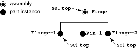 For example, consider Figure 2.10.1–2. In this model the assembly (Hinge) contains three part instances (Flange-1, Flange-2, and Pin-1). Multiple sets named top can be defined: in this case one is defined within the assembly and one is defined within each of the Flange part instances. The set name top can be reused, and each set named top is independent from the others.