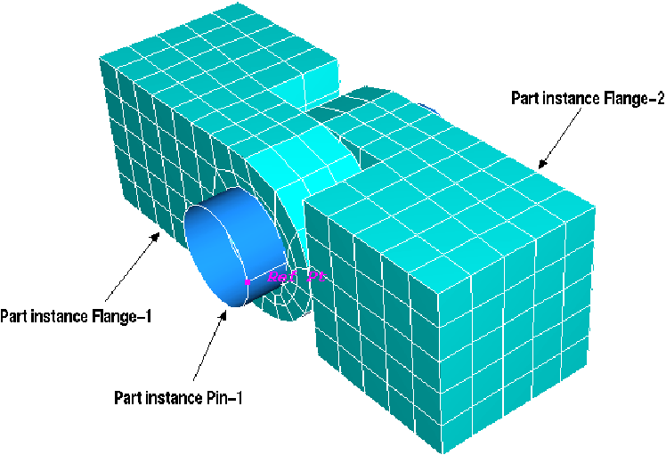 • The Flange part is instanced twice in the Hinge assembly. Therefore, the model contains two element sets named Flat: one belongs to part instance Flange-1, and the other belongs to part instance Flange-2.
