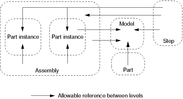 When creating a model, it is often necessary to refer to something outside of the current level; for example, a section definition within a part must refer to a material, which is defined at the model level. Loads defined within a step must refer to sets within the assembly. But some references between levels are not allowed; for example, a set in one part instance cannot refer to nodes in another part instance. The following references are allowed: