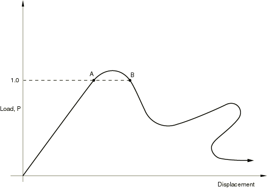 Alternatively, static equilibrium states during the unstable phase of the response can be found by using the “modified Riks method.” This method is used for cases where the loading is proportional; that is, where the load magnitudes are governed by a single scalar parameter. The method can provide solutions even in cases of complex, unstable response such as that shown in Figure 6.2.4–1.