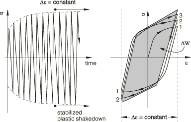 The elastic material stiffness at a material point remains constant and contact conditions remain unchanged when the stabilized solution is computed at a given point in the loading history. Each of the solutions along the loading history represents the stabilized response of the structure subjected to the applied period loads, with a level of material damage at each point in the structure computed from the previous solution. This process is repeated up to a point in the loading history at which a fatigue life assessment can be made.