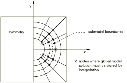 The results from the global analysis must be saved at all nodes required for the interpolation of the driven variables to the boundary of the submodel (see Figure 10.2.2–1). The results (.fil) file or the output database (.odb) file can be used for this purpose.
