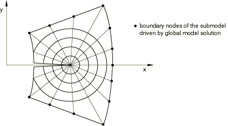Your submodel analysis is driven, either partly or completely, from the results obtained from a global model analysis. The results from the global model are interpolated onto the nodes on the appropriate parts of the boundary of the submodel (see Figure 10.2.2–1). Thus, the response at the boundary of the local region is defined by the solution for the global model. The driven nodes and any loads applied to the local region determine the solution in the submodel.