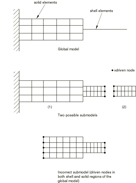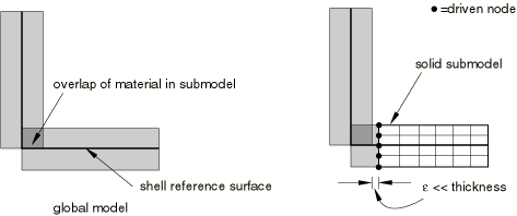 The linear or nonlinear response of a global shell model can be used to drive the submodel response of a solid submodel. The driven variables are displacements, which are determined from global model displacements and rotations.
