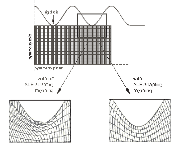 Arbitrary Lagrangian-Eulerian (ALE) adaptive meshing provides control of mesh distortion. ALE adaptive meshing uses a single mesh definition that is gradually smoothed within analysis steps. ALE adaptive meshing is available for limited applications in Abaqus/Standard and is more generally applicable in Abaqus/Explicit. The term ALE implies a broad range of analysis approaches, from purely Lagrangian analysis, in which the node motion corresponds to material motion, to purely Eulerian analysis, in which the nodes remain fixed in space and material “flows” through the elements. Typically ALE analyses use an approach between these two extremes. The ALE feature is distinct from the Eulerian analysis capability in Abaqus/Explicit, which is described in “Eulerian analysis,” Section 14.1.1.