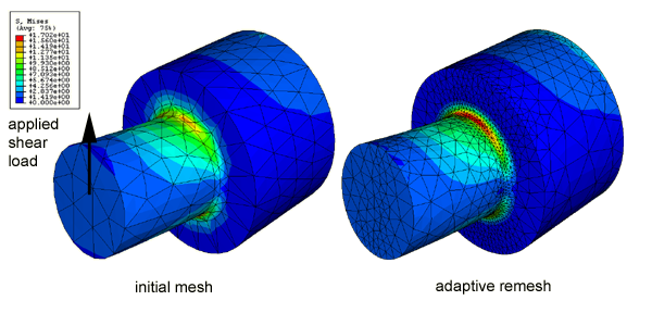 Adaptive remeshing is typically used for accuracy control, although it can also be used for distortion control in some situations. The adaptive remeshing process involves the iterative generation of multiple dissimilar meshes to determine a single, optimized mesh that is used throughout an analysis. Adaptive remeshing is available only for Abaqus/Standard analyses submitted from Abaqus/CAE. The goal of adaptive remeshing is to obtain a solution that satisfies mesh discretization error indicator targets that you set, while minimizing the number of elements and, hence, the cost of your analysis. You can use adaptive remeshing to obtain a mesh that provides a balance between solution cost and desired accuracy. Figure 12.1.1–2 illustrates a case where adaptive remeshing improves the quality of the stress result around a fillet with targeted mesh refinement.