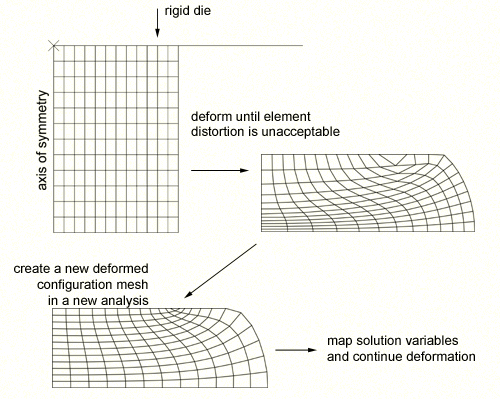 Adaptive remeshing involves an iterative process to determine a single, optimized mesh that is used through an analysis. The iterative process and the remeshing are controlled in Abaqus/CAE. Each successive analysis job covers the same simulation history time period but uses a different mesh. Once the adaptive remeshing process is complete, a single mesh and a single analysis job represent your entire analysis history. See “Adaptive remeshing: overview,” Section 12.3.1, and “Understanding adaptive remeshing,” Section 17.13 of the Abaqus/CAE User's Guide.Mesh-to-mesh solution mapping is available only in Abaqus/Standard. You can use this technique to control element distortion in cases where large deformation occurs by replacing the mesh and continuing the analysis. Figure 12.1.1–3 illustrates a case where solution mapping is used in conjunction with a new mesh to overcome difficulties associated with element distortion.