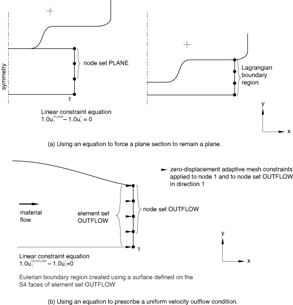 As an example, a constraint can be applied to force a plane section to remain plane in a Lagrangian adaptive mesh domain, as shown in Figure 12.2.2–12(a). In this case all nodes are constrained by an equation to lie in the same plane throughout the analysis, but adaptive meshing is allowed within the plane.