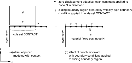 In this example the punch is replaced by a sliding boundary region with a constant velocity boundary condition applied in the area of “contact.” A tangential mesh constraint is applied to the edge of the boundary region at node N (the other edge is constrained by the Lagrangian boundary region created automatically on the symmetry plane). This problem definition allows material to flow radially underneath the “punch” while retaining the original size and location of the “contact” area.
