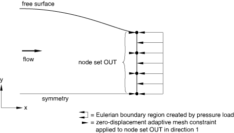 As another example, consider the outflow boundary of an Eulerian domain, as shown in Figure 12.2.2–12(b). The outflow boundary of an Eulerian domain is often assumed to be far enough downstream that the velocity is uniform but unknown. To model this condition, an Eulerian boundary region is created at the outflow boundary using a surface. An adaptive mesh constraint is used to fix the mesh perpendicular to the boundary, and all nodes on the plane are constrained by an equation to have the same velocity orthogonal to the plane.