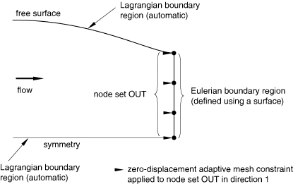 An Eulerian boundary region can never overlap a Lagrangian or sliding boundary region. Furthermore, an Eulerian boundary region can never share a boundary with or overlap a nonadaptive region. Because infinite elements are nonadaptive, this latter restriction implies that infinite elements cannot be used to simulate ambient conditions at an outflow boundary.