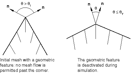Geometric features affect only Lagrangian and sliding boundary regions, where they act as temporary Lagrangian edges. During each mesh sweep in an adaptive mesh increment, nodes along a geometric edge are positioned by applying the basic smoothing methods (see ALE adaptive meshing and remapping in Abaqus/Explicit, Section 12.2.3). The nodes are constrained to lie along the discrete geometric edge unless the angle forming the geometric edge becomes less than the transition geometric feature angle, (). The default value for the transition feature angle is . If the angle across the geometric edge becomes less than , the boundary surface is considered to be flattened sufficiently for the feature to be deactivated, and the mesh is allowed to slide freely over the material (unconstrained by the deactivated geometric edge). Geometric corners are allowed to flatten in a similar fashion. This logic allows great flexibility in mesh adaptation while preserving geometric features in the model.