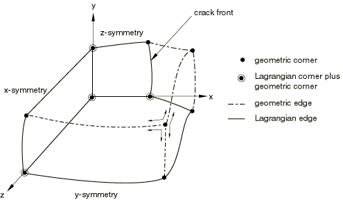 Figure 12.2.2–2 shows an example in which boundary regions are created by applying surface-type boundary conditions. This figure shows a block of material with a crack and three symmetry planes (therefore, three Lagrangian boundary regions). Material will not flow across any symmetry plane, yet adaptive meshing can be performed within each Lagrangian boundary region. This flexibility is often helpful in problems that have significant deformation.