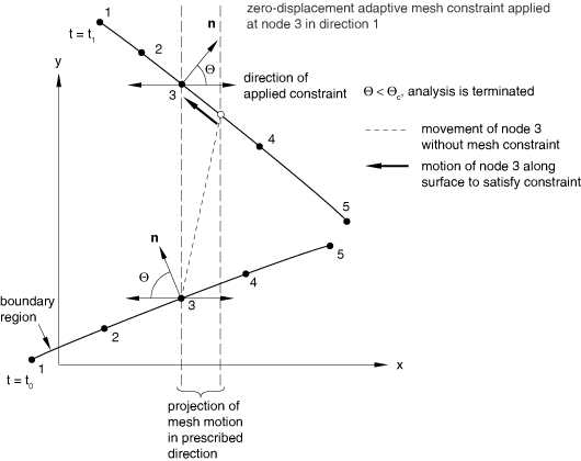 In most adaptive mesh problems the motion of nodes in the mesh is determined by the meshing algorithm, with constraints imposed by the domain boundary and the boundary region edges. However, there are cases when you must explicitly define the motion of the nodes. As explained earlier, Eulerian and sliding boundary regions generally require mesh constraints for the regions to be physically meaningful. In some problems you may wish to keep certain nodes fixed, to move nodes in a particular direction, or to force certain nodes to move with the material. In other problems you may desire a node or particular set of nodes to follow the material motion. Adaptive mesh constraints allow full control over the mesh movement and act independently of any boundary conditions or loads applied to the underlying material.