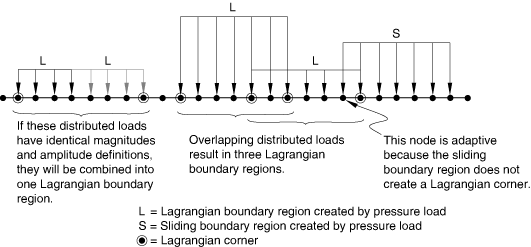 A Lagrangian boundary region can overlap any number of other Lagrangian or sliding boundary regions (see Figure 12.2.2–11). If two boundary regions partially overlap, three regions are formed: the overlapping region and the two initial regions minus the overlapping region. A sliding boundary region is formed when a Lagrangian and a sliding boundary region overlap.