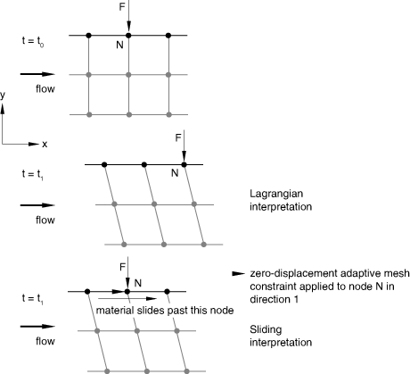 The mesh is constrained to move with the material in the direction normal to the boundary region, but it is completely unconstrained in the directions tangential to the boundary region. Thus, a sliding boundary region can be thought of as a “mesh patch” that moves independently of the underlying material.
