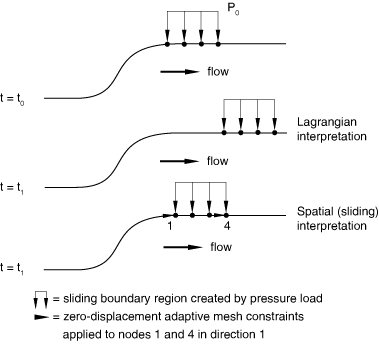 Two types of boundary region edges can exist: Lagrangian and sliding. Lagrangian edges are always associated with a material line. Material can never flow past a Lagrangian edge, and nodes can move only along a Lagrangian edge (like beads on a string). Sliding edges are associated only with the mesh. Material can flow past a sliding edge (that is, sliding edges are free to slide over the underlying material).