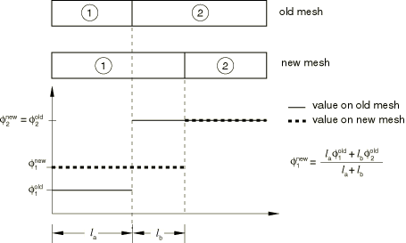 , is remapped from the old mesh to the new mesh by first assuming a constant value of the variable for each old element. These values are then integrated over each new element. The new value of the variable is found by dividing the value of each integral by the new element volume.