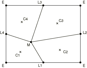 Volume smoothing determines the weight function by computing a volume-weighted average of the element centers in the elements surrounding the node. In Figure 12.2.7–1 the new position of node M is determined by a volume-weighted average of the positions of the element centers, C, of the four surrounding elements. The volume weighting will tend to push the node away from element center C1 and toward element center C3, thus reducing element distortion.