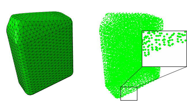The example shown in Figure 15.2.1–1 contrasts the two approaches. Both discrete representations model the initial configuration of a body of fluid inside a bottle, as described in detail in “Impact of a water-filled bottle,” Section 2.3.2 of the Abaqus Example Problems Guide. The model on the left is a traditional tetrahedron mesh of the volume occupied by the fluid. On the right, the same volume is represented by a collection of discrete points. Note that in the latter case there are no edges connecting the points as these points (pseudo-particles) do not require the definition of multiple-node element connectivity, as is the case in the traditional finite element representation on the left. An alternative to directly defining particle elements is to define conventional continuum finite elements and automatically convert them to particle elements at the beginning of the analysis or during the analysis, as discussed in “Finite element conversion to SPH particles,” Section 15.2.2.